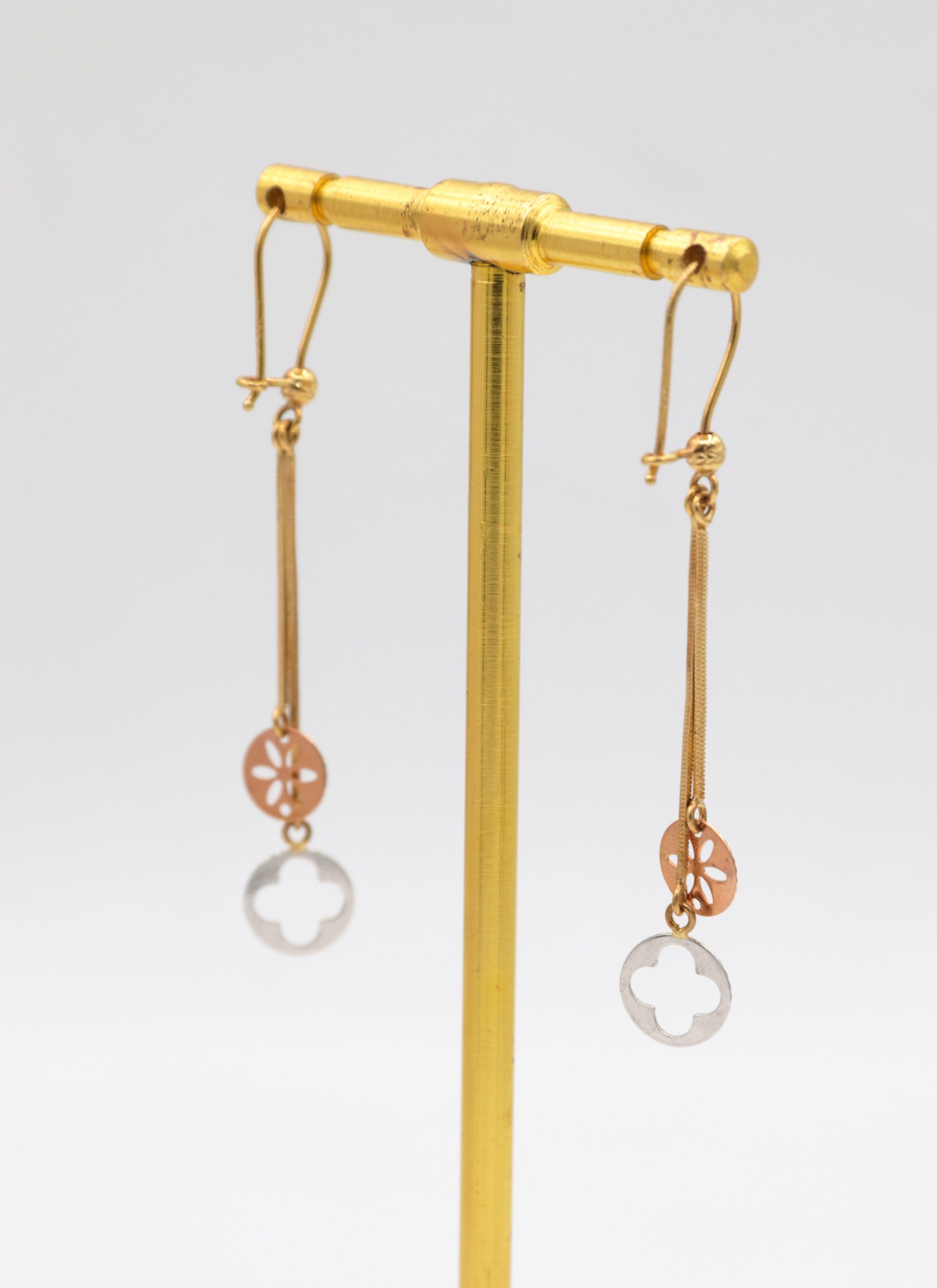 گوشواره های آویزی ساخته شده از طلای 18 عیار، جلوه ای درخشان و چشمگیر دارند.
